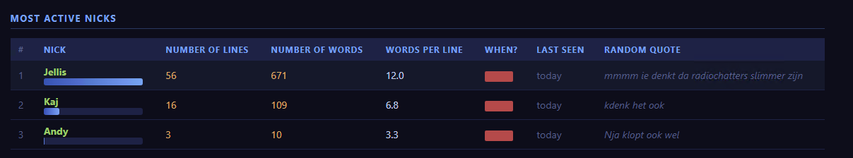 | # | Nick | Number of lines | Number of Words | Words per line | When? | Last seen | Random quote |